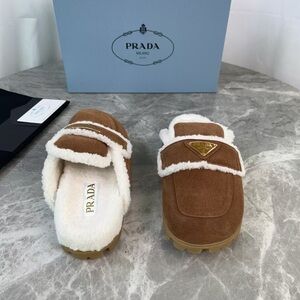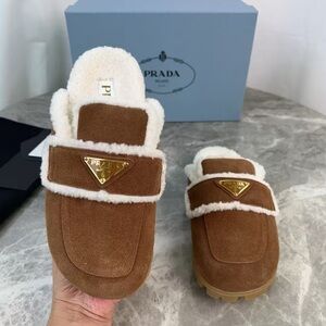 Luxurious brown suede slippers. Soft white fur trim. Iconic Prada logo detail.