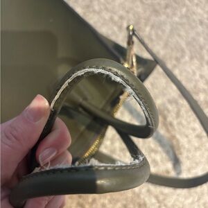 Michael Kors large satchel in olive green. Features dual handles and a detachable strap. This bag has been used and is showing its age. The body of the purse is in good condition but there is peeling of the handles (see photos) and a few small ink stains inside the bag (see photos).