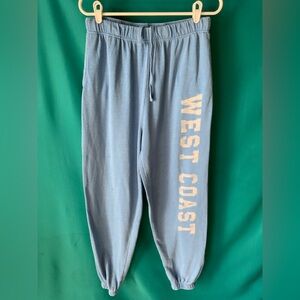 Comfortable blue joggers featuring 'West Coast' print in white. Perfect for casual wear. GARAGE CLOTHING, WOMENS’ SWEATPANTS, DRAWSTRING WAIST, 2 SIDE POCKETS, LIGHT BLUE, 60% COTTON, 40% POLYESTER, size: M, 28” WAIST, 28” INSEAM, a little wear and tear in one spot as pictured
