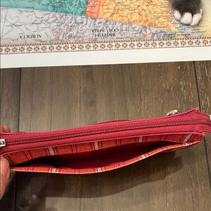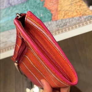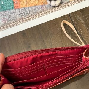 Elegant Coach wristlet with red plaid design. Features tan leather strap. Ideal for any occasion.