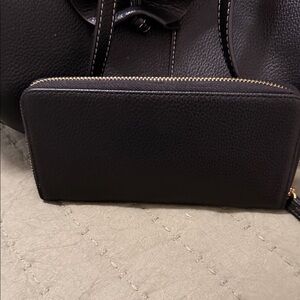 Elegant black leather like tote bag with matching wallet. Perfect for everyday use and special occasions.