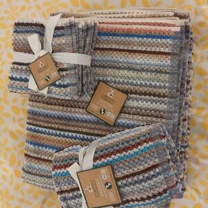 Luxurious towel set with multicolor stripes. Includes 4 bath towels, 2 hand towels and 4 wash cloths. Perfect for adding style to your bathroom.