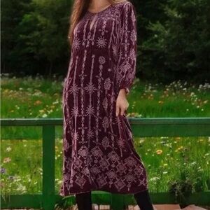 The Johnny Was Althea Velvet Maxi Dress in burgundy/purple is a boho-inspired piece perfect for casual occasions. This long-sleeve dress features intricate embroidered accents and a luxurious velvet fabric, making it a stylish choice for any season. With a midi length and size XS, this new with tags dress from Johnny Was is designed for women looking for a unique and comfortable outfit that can be dressed up or down effortlessly.