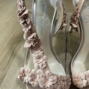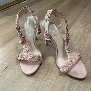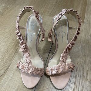 Step out in style with these super stylish and elegant pink floral suede slingback heels from Jessica Simpson. Size 8. Perfect for any occasion, these shoes offer a little embellishment to any outfit. In good condition. Only wore once to a wedding!