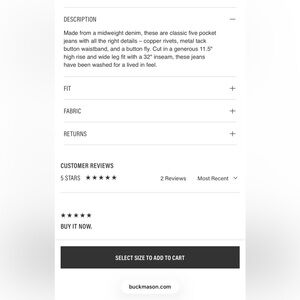 Sold out Jet Set Jeans from Buck Mason in Black size 26. These are amazing wide-leg style jeans made from 100% cotton denim twill - a classic fit that will last forever. They are in excellent condition with no flaws that I can find. Super high quality that you would expect from this brand!