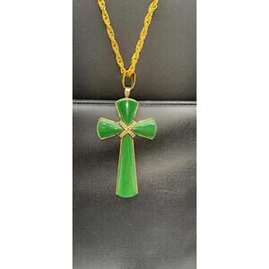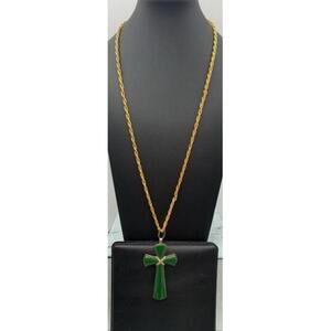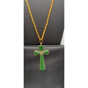Vintage Avon Gold Tone Green Faux Jade Cross Pendant Necklace 24 in