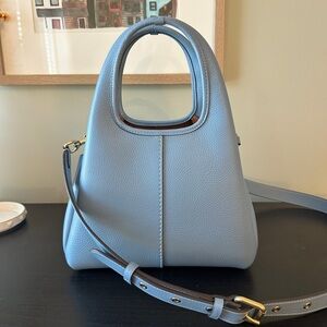 Chic Coach shoulder bag in light blue leather. Features a modern design with gold-tone hardware. Perfect for elevating any outfit.
