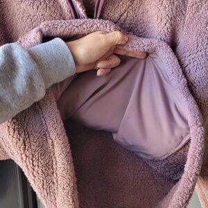 ● Cozy purple fleece jacket with a hood ● Features a front zipper and pockets