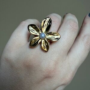Elegant gold floral statement ring with a central pearl accent. Perfect for adding a touch of luxury to any outfit.