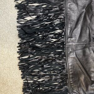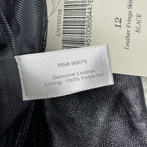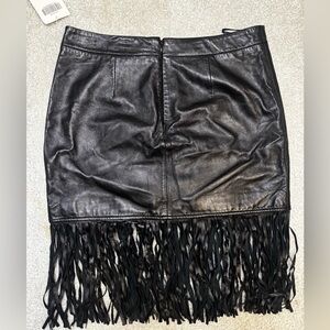 Sleek black leather skirt with stylish fringe. Ideal for a night out. NWT, size 12. 100% leather with poly lining. Y2K/90’s