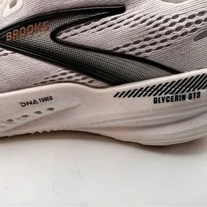 Sleek Brooks running shoes in white and gray. Ideal for runners.