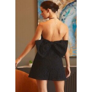 Look stunning in this gorgeous strapless mini dress with a bow back design, lace material throughout, slight flare skirt, and side zip closure.