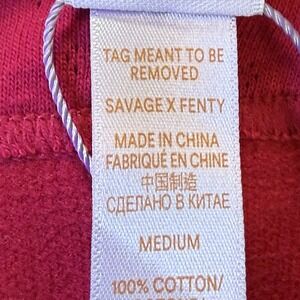 This Savage X Fenty crop top in size M is a stylish and comfortable addition to any woman's wardrobe. Made of lightweight cotton with a solid red color, this blouse features long sleeves and a scoop neckline, perfect for a casual occasion. The pullover closure and slim fit make it easy to wear and flattering. The logo band adds a touch of signature style to this cropped top, ideal for the warmer seasons of summer and spring. Easy to care for with machine washable fabric, this top is a versatile and trendy choice for any fashion-forward woman.