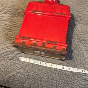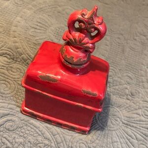 Charming red ceramic vase with ornate lid. Perfect for decor or storage. Not for food use! Purposely distressed.