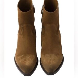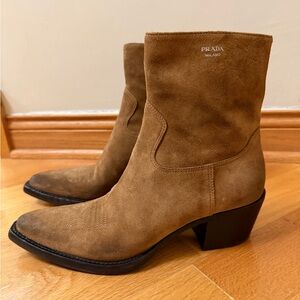 Chic brown suede boots by Prada. Features ankle height and block heel.
