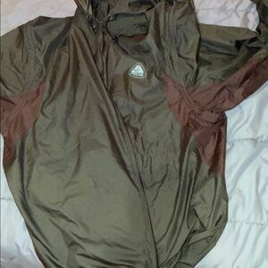 Nike ACG windbreaker with olive and brown tones. Lightweight and durable. Ideal for outdoor activities. This has been worn a few times. This turns into a vest as well as a jacket. Spot on front of the jacket
