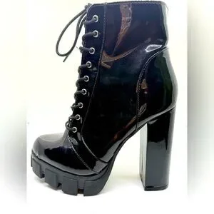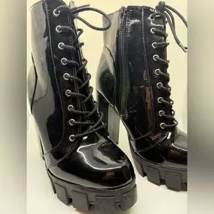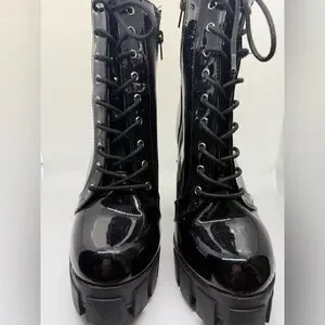 Step into fierce fashion with these black patent lace-up platform boots! Featuring a chunky lug sole, block high heel, and sleek patent finish, these boots bring an instant grunge-meets-glam vibe to any outfit. The side zipper makes them easy to slip on and off, while the lace-up front provides an adjustable, secure fit.