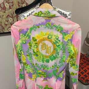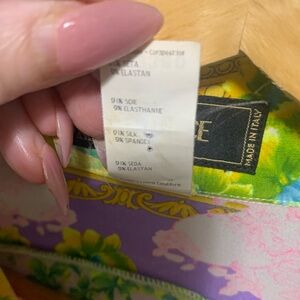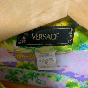 Bold Versace shirt with vibrant floral design. Features green, yellow, and pink hues. Eye-catching and stylish. Authentic! In very good condition with zero flaws. This is a collectors must as the buttons and the colours are completely eye catching! There isn’t a size tag listed but between a zero to 2. Please ask Amy questions before purchasing. Offers are welcome! Thank you.