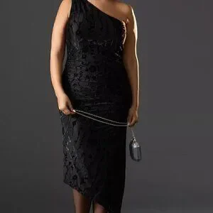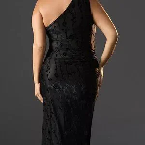 One shoulder, asymmetrical hem. Sheer overlay with velvet flowery pattern, fully lined.