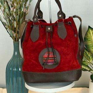 Step back in time with this stunning authentic vintage bag. Crafted with genuine materials and a rich cultural history. Handmade in Boliva, a true artisan piece with indigenous roots. It is 100% genuine suede body and rich brown leather trim, base, and straps that was all tooled by hand. Features a striking circular medallion with traditional Andean folk tapestry weaving. Drawstring cinch closure, top handles, and an adjustable crossbody strap. Circa 1970's with true vintage boho/hippe vibe for the true vintage lover. Bag is in excellent condition - no rips, stains or rubbing of leather or suede. Handles are sturdy and in pristine condition. Drawstring closure has no wearing of leather and is in perfect working order.