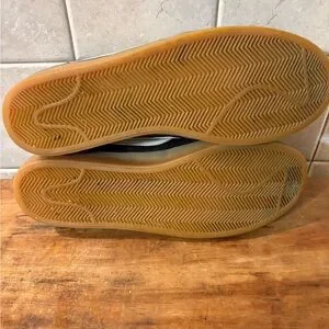 Classic Nike sneakers with a black upper and white swoosh. Comfortable and stylish for everyday wear.