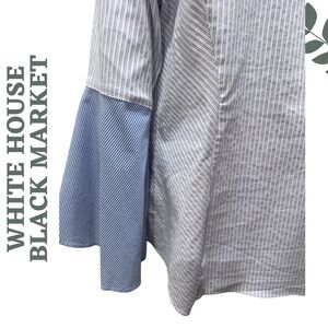 WHBM blue & white striped blouse with contrast bell sleeves, collared neckline, stretch cotton blend, polished tailored fit. Workwear, business casual, flattering silhouette.