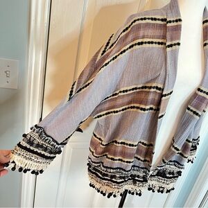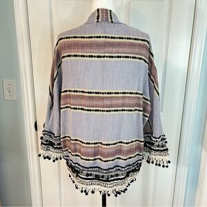 Stylish open front cardigan with striped pattern and fringe details. Features shades of blue, black, and cream. Good preowned condition with no flaws - Some wash wear evident. Measurements are shown in pictures Ships same/next day Bundle and save 🛍️ Offers welcome! Be sure to double check your measurements. Message me if you have any questions 🙂 ✨ New to Poshmark? Use code CLASSCOUTURE and get 15% off your first purchase. Style Tags: Boho Bohemian Beachy Festival Concert Layering Pom poms Fringe