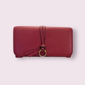 Elegant Chloé long wallet crafted in pebbled red leather, finished with the brand’s signature gold-tone ring and tassel detail. A timeless, feminine design that works beautifully as a daily wallet or slim clutch.