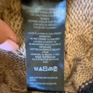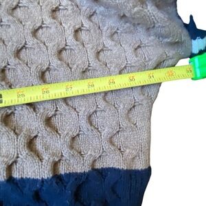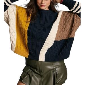 Stylish patchwork design. Features navy, mustard, cream, and brown. Crew neck style. Perfect for layering.