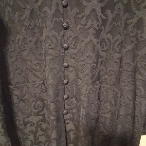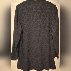 Elegant black button-up tunic with a subtle pattern. Perfect for casual or formal wear.