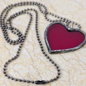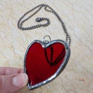 Stained Glass Heart Handmade Cherry Red Silver Tone Necklace Sun Catcher