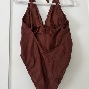 Stylish brown halter one-piece swimsuit with a front knot detail.