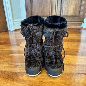 Ultra cozy and chic winter boots, perfect for elevating your après ski style. Sold out dark brown fur with durable design. Ideal for cold weather. Original box and all packaging included.