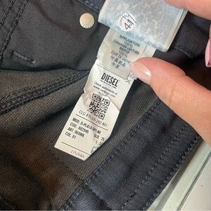 Excellent new with tag's condition. Black ‘D-Plata Jogg’ jeans from Diesel. Crafted from JoggJeans fabric developed by the label, this high-waisted design is complete with a zip fly and button. 900 Denim. Please note tag states inseam of 32inch, please see measurements in photos, I am getting closer to a 27 inch following the inner leg inseam.