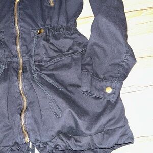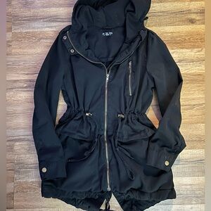 Chic black utility jacket with a hood. Features zip closure and adjustable waist. Ideal for layering.