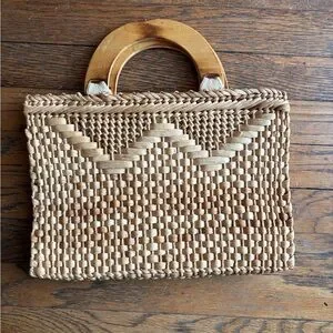 Elevate your style with this handcrafted tan woven bag. Featuring elegant wooden handles, this bag is perfect for any occasion. Its natural tones add a touch of sophistication to your ensemble.