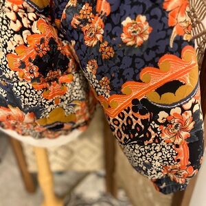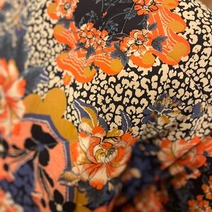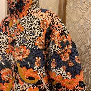Bold floral jacket with vibrant patterns. Features a mix of red, orange, and blue tones with animal print. Perfect for a stylish and warm look.