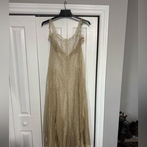 Stunning gold maxi dress by Valentino. Features delicate lace detailing. Ideal for elegant events.