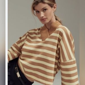 Smashing looking v-neck pullover by Anthropologie brand, Maeve. Very oversize boxy with wide drop sleeves. Great colour mix of tan and yellow stripes. 100% cotton with tan ribbed knit collar & cuffs. The first 4 photos are from the Anthropologie web site to show the fit. Reg. US $98. Actual garment is shown. PTP 28" .Will fit up to a large! EUC.