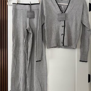 Chic gray knit cardigan by Marled. Accented with black trim. Perfect for layering.