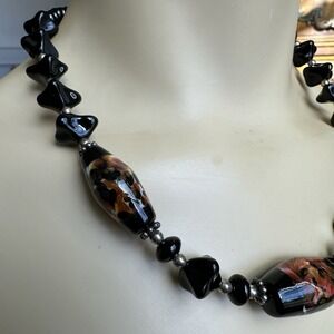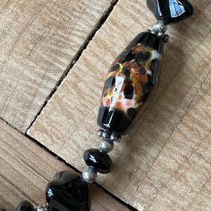 Vintage Artisan Beaded Necklace 18 Inch Black Onyx Art Glass 925 Sterling 60.8g