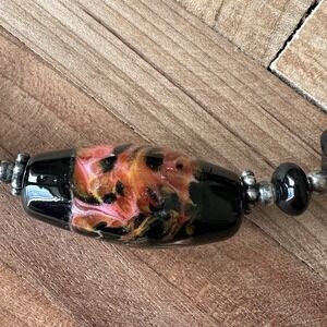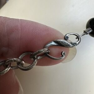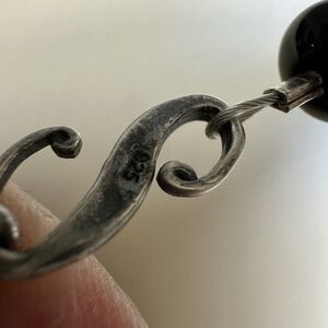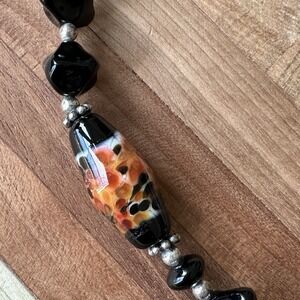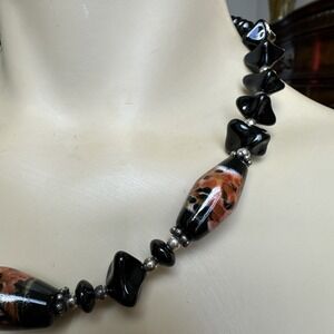 This vintage artisan crafted beaded necklace features a black onyx art glass pendant on a purity hallmarked 925 sterling silver S clasp and accent beads, measuring 18 inches in length 60.8 grams precious metal, stones, and art glass. The necklace is handmade and has a bohemian, retro style, making it a unique and eye-catching accessory for various occasions such as Valentine's Day, Easter, Mother's Day, Graduation, Prom Homecoming, Christmas, engagements, weddings, anniversaries, birthdays, and even daily office professional wear. The black onyx stone is freeform shaped with nice polish and natural inclusions in the stone matrix, creating a natural beauty that complements the overall design of the piece. This bead necklace has three beautiful art glass accents and is in good pre owned clean condition with moderate use wear. Please review the pictures for details and size measurement info, thank you.
