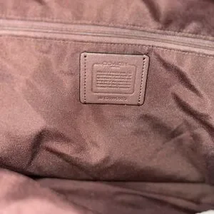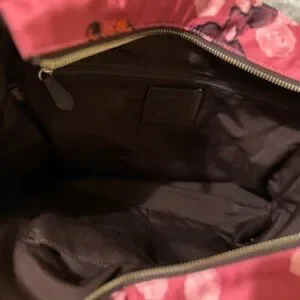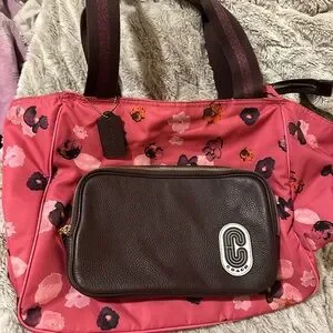 Chic Coach tote with pink floral pattern. Features rich brown accents and front pocket. Ideal for everyday style.