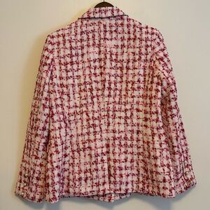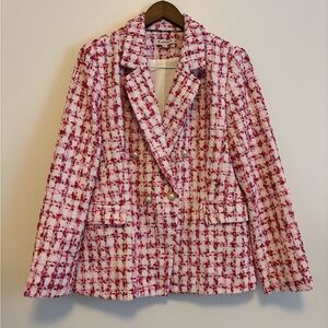 Chic tweed blazer with a double-breasted design. Features a stylish pink and white pattern. Ideal for adding elegance to any outfit. Great pre owned condition. No flaws to note.
