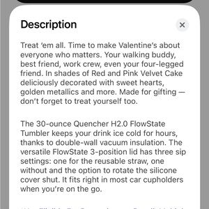 NWT The Valentine’s Day Quencher H2.0 Flowstate Tumbler. 30 oz stainless steel tumbler. Color is Pink Velvet Cake. Unwrapped it when I first got it, but wrapped it back up immediately. Brand new with tags and in original packaging.