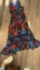 Bold dress with intricate patterns. Features rich blue, orange, and red hues.