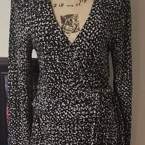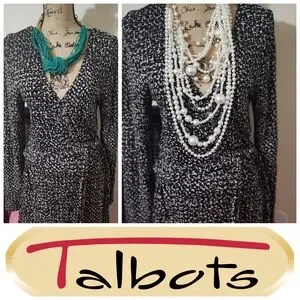 Chic Talbots dress with a striking monochrome pattern. Features long sleeves and a flattering wrap style.