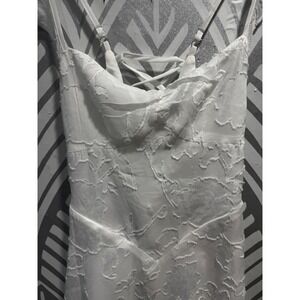 A charming white mini dress with a delicate lace overlay. This dress features a flattering sweetheart neckline, playful ruffle cap sleeves, and an adjustable tie-back closure for a customized fit. The intricate floral lace pattern adds a touch of romance, making it perfect for bridal showers, garden parties, or a romantic date night.