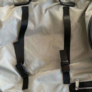 There are multiple handles and straps that allow this multi-functional tote to be carried in a variety of ways. The front straps may be large enough to secure a yoga mat.