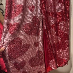 Dazzle in this sequin midi dress. Features a bold heart pattern. Perfect for a glamorous look.